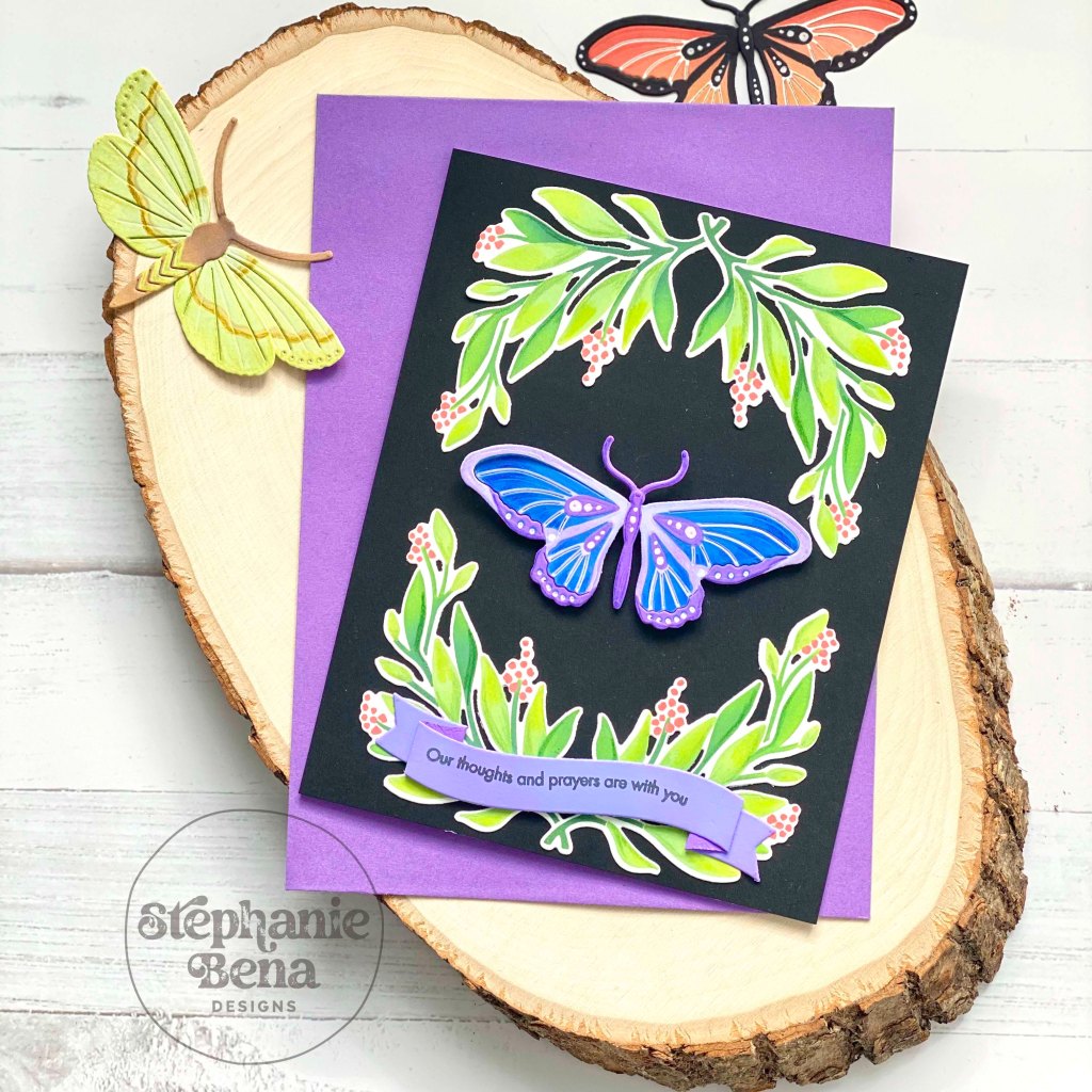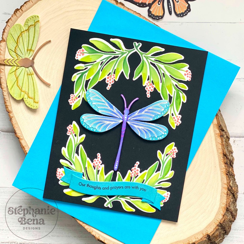 To make the cards, I started with the greenery. I diecut them out first, then I overlayed the stencil to ink them with Distress Oxides. I let them dry a bit then added in a little shading with Prisma Color pencils. Once the greenery was done, I started on the butterfly and dragonfly. I actually made several of each and picked my favorites for the cards. I went about creating them the same way I created the greenery. I picked out some color combos from my Distress Oxides and inked them then added shading with Prisma Color pencils and white gel pen highlights.
